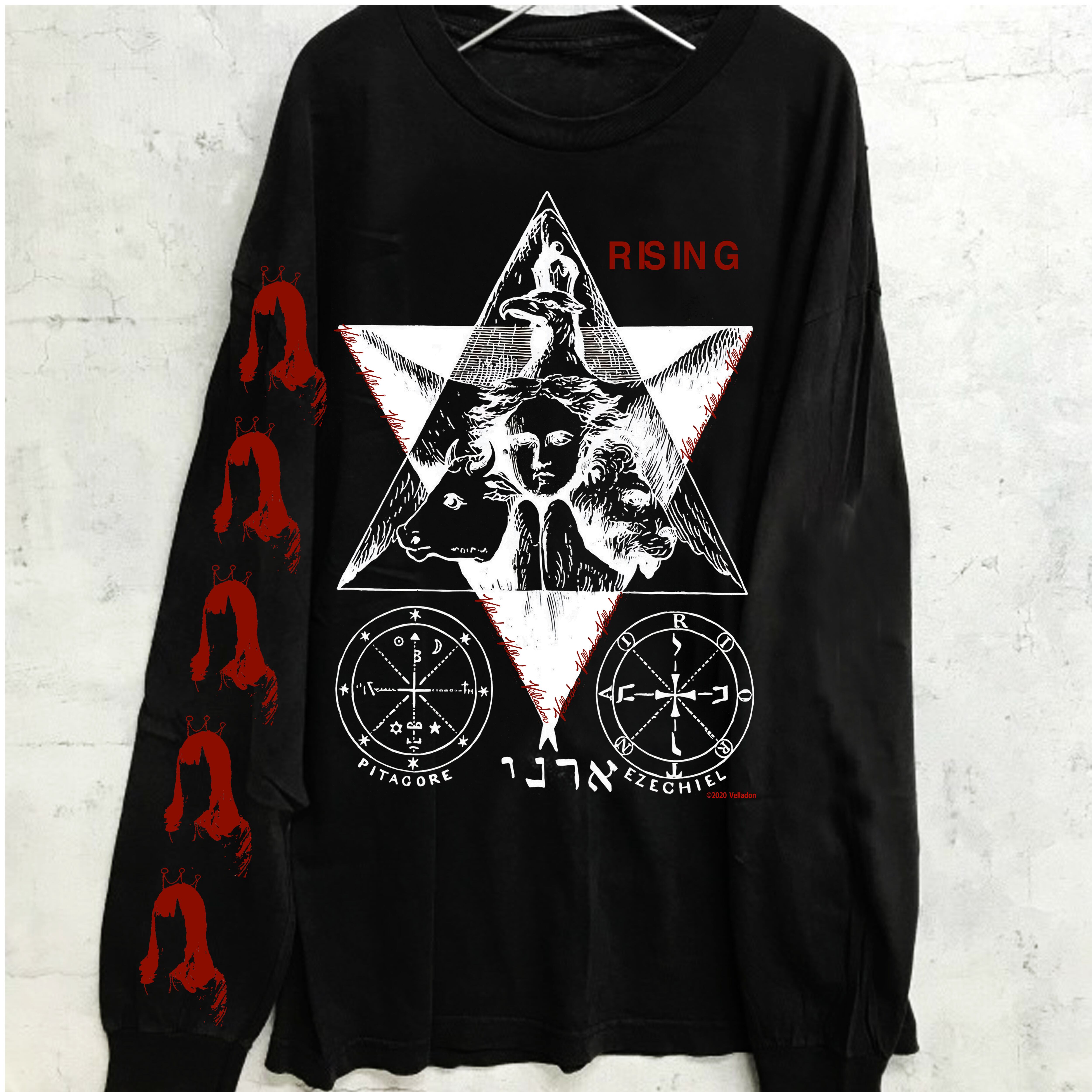 多くを語らないゴシックなフロントプリントのトライアングル部分には、ヴィンセント・ギャロが手がけた Velladonのロゴが幾つも配置されています。
